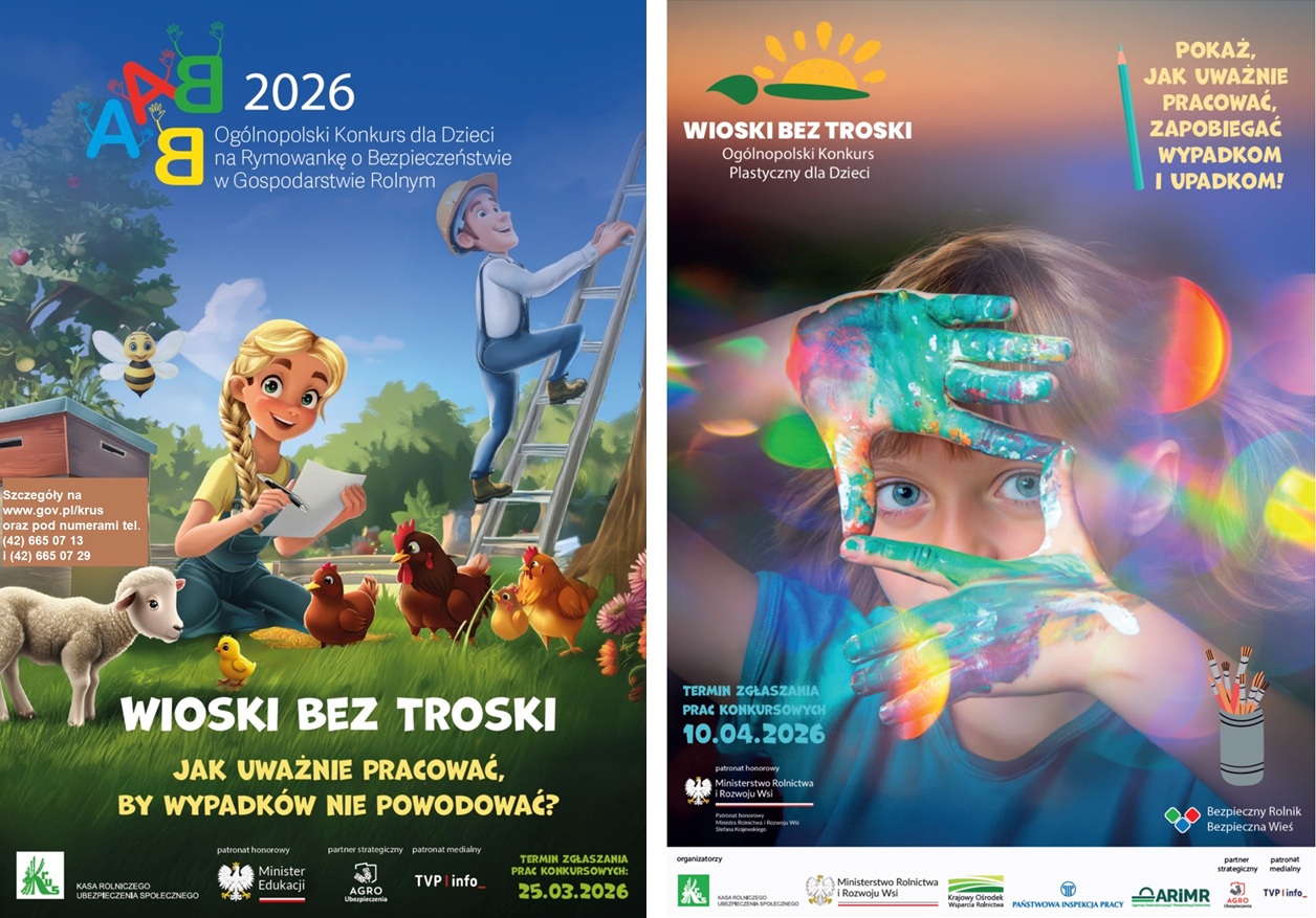 W 2026 roku organizujemy dwa konkursy dla dzieci pt. „Wioski bez troski”. Przedstawiamy obie propozycje, które mogą wpłynąć na wzrost świadomości na temat dbania o zdrowie w gospodarstwie rolnym zarówno najmłodszych mieszkańców terenów wiejskich jak i ich rodziców.